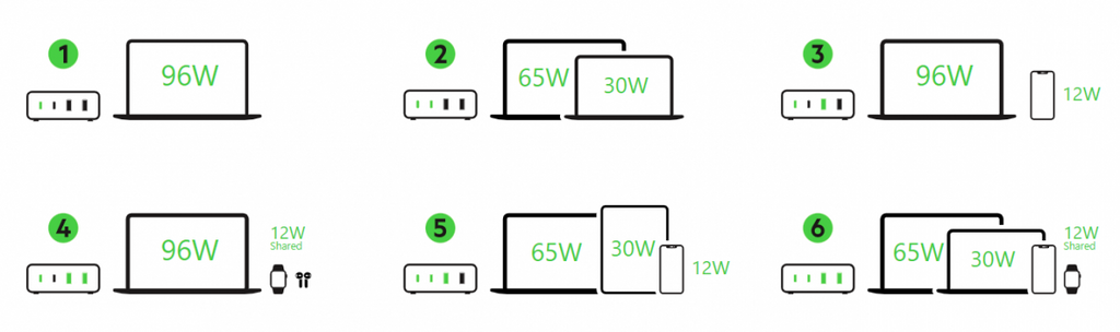 為各種手提電腦、平板電腦、智能手機等充電,包括 MacBook、Chromebook、其他 USB-C 手提電腦、iPhone、iPad、三星智能手機、Apple Watch 及其他相容裝置。4 部裝置,1 個充電器
